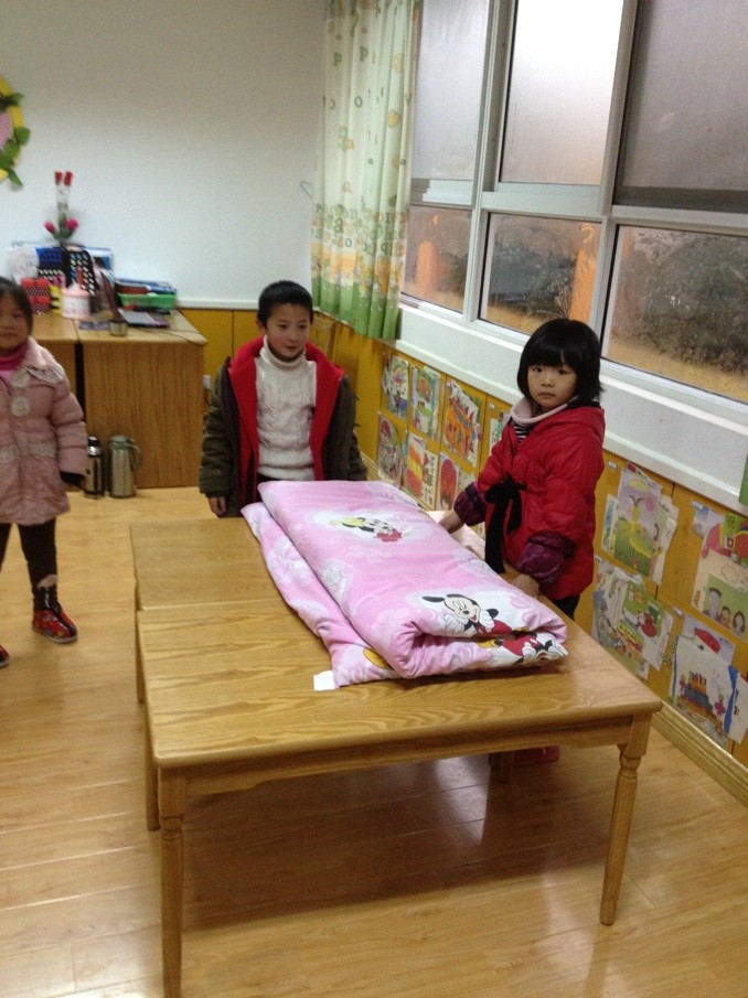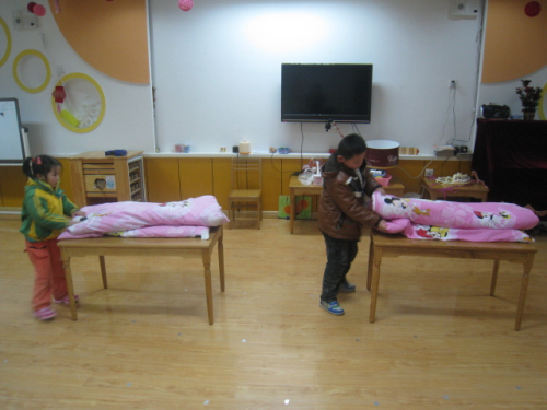 为了提高幼儿的自我服务能力,培养良好的生活习惯,在2012年12月21日下午我们大班年级组各班在班级内举行了幼儿自理能力——叠被子比赛。在比赛过程中孩子们个个摩拳擦掌,信心满满,跃跃欲试,先通过回忆之前叠被子的经验,了解叠被子的步骤,最后在老师的一声令下开始了比赛。通过比赛孩子们找到了又快又整齐将被子叠整齐的方法。