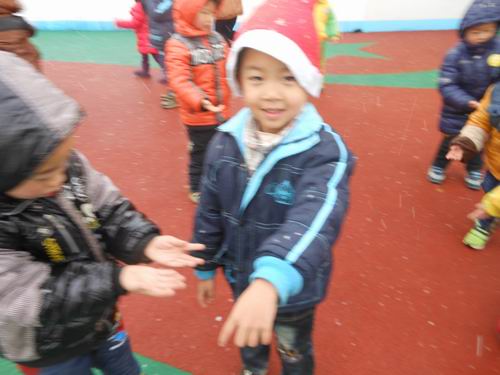 孩子们好像看到久别的亲人一样,很快就融入雪景中,飞舞的雪花相伴孩子的欢笑声,穿廊上留下了一串串欢快的脚印。“老师,雪花是白色的”,“雪花是纯洁的天使”老师回答,“只要心地善良,天使就会落在你的手心,走进你的心里。”孩子们都伸出双手,雪花承受不了手心的温度,变成水滴落在地下。顿时穿廊成了孩子们的课堂,孩子们笑着、转着、跑着、跳着、唱着、讨论着……。为确保孩子们下雪天安全,回到教室老师进行下雪天的安全教育。一是交通安全教育。下雪天地冻路滑,尤其大雪后,随积雪的融化,路面更难行走;幼儿园要求孩子在园要轻走慢行,不互相追逐;遇有冰冻地面必须绕道行走;不要到危险场所玩雪。二是防寒保暖教育。教师及时提醒孩子适时增减衣服、穿好棉衣棉鞋,戴好手套,防止冻坏身体、冻伤手脚,防止孩子感冒。教室内至少要开一扇窗户,确保室内的空气新鲜。