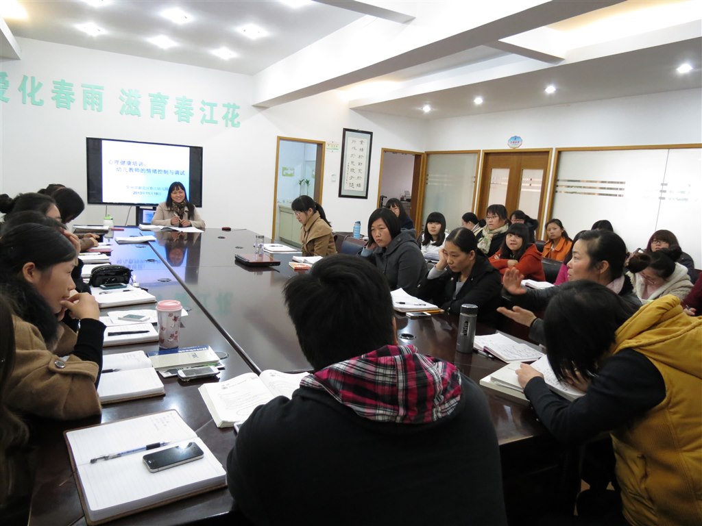 情绪,是指人对认知内容的特殊态度。良好的正面情绪能让幼儿产生积极地体验,从而转化为幼儿发展的内在动力。为了让春幼全体教师能有一个传递正能量的情绪,以更饱满的热情和心态去面对我们的孩子,2013年11月18日下午,春江幼儿园全体教师在会议室聆听了赵腊美园长进行的关于健康的心理健康讲座《幼儿教师的情绪调适与控制》。